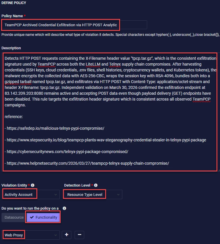 Detects HTTP POST requests containing the X-Filename header value "tpcp.tar.gz", which is the consistent exfiltration signature used by TeamPCP across both the LiteLLM and Telnyx supply chain compromises. After harvesting credentials (SSH keys, cloud credentials, .env files, shell histories, cryptocurrency wallets, and Kubernetes tokens), the malware encrypts the collected data with AES-256-CBC, wraps the session key with RSA-4096, bundles both into a gzipped tarball named tpcp.tar.gz, and exfiltrates via HTTP POST with Content-Type: application/octet-stream and header X-Filename: tpcp.tar.gz. Independent validation on March 30, 2026 confirmed the exfiltration endpoint at 83.142.209.203:8080 remains active and accepting POST data even though payload delivery (GET) endpoints have been disabled. This rule targets the exfiltration header signature which is consistent across all observed TeamPCP campaigns.