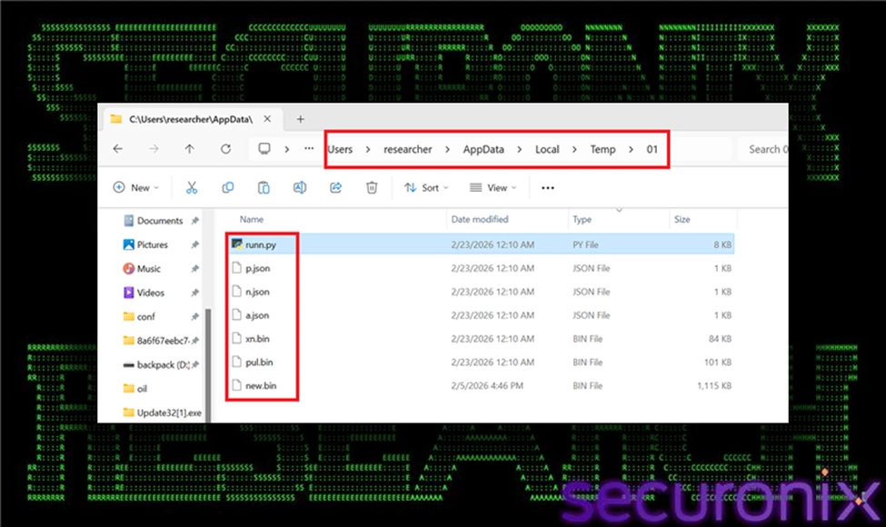 With the embedded Python runtime successfully staged and extracted, the malware transitions into its core operational phase. It executes its primary payload using the command: