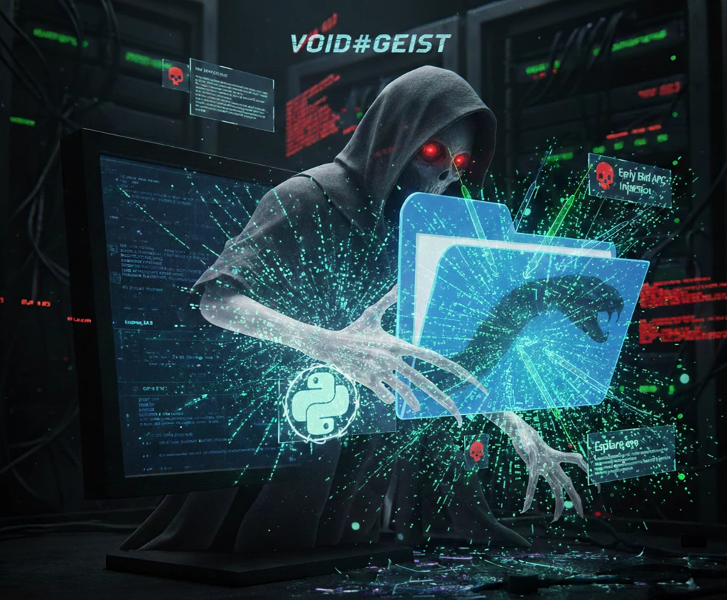 The VOID#GEIST campaign executes decrypted shellcode entirely in memory through Early Bird APC injection into legitimate system processes (e.g., explorer.exe).