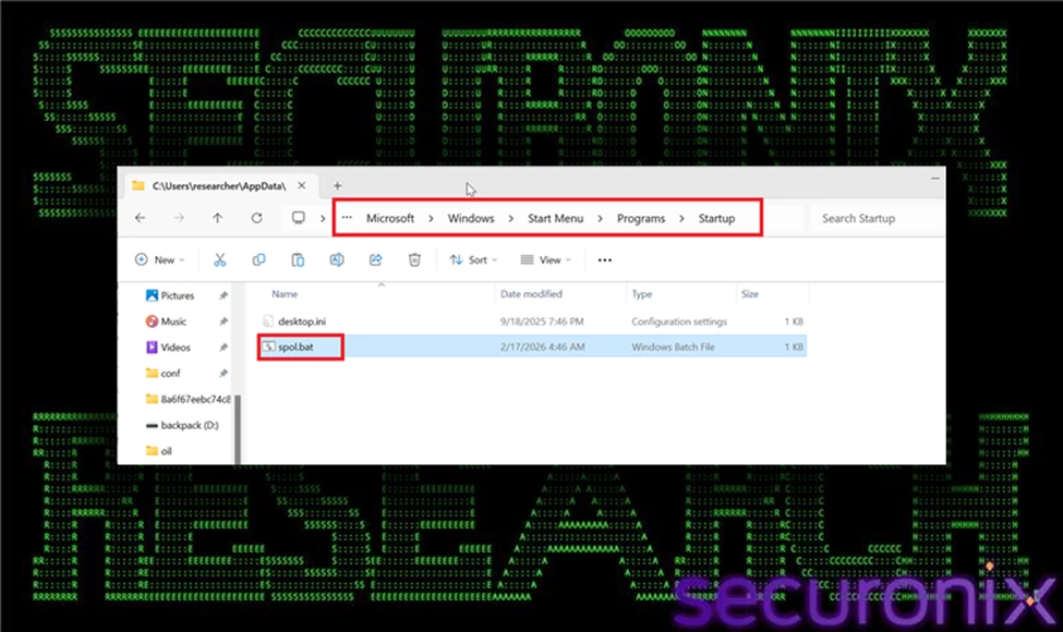 - Startup folder persistence:The malware deploys a batch script (spol.bat) into the user’s Startup directory, ensuring automatic execution at system login without requiring elevated privileges.
